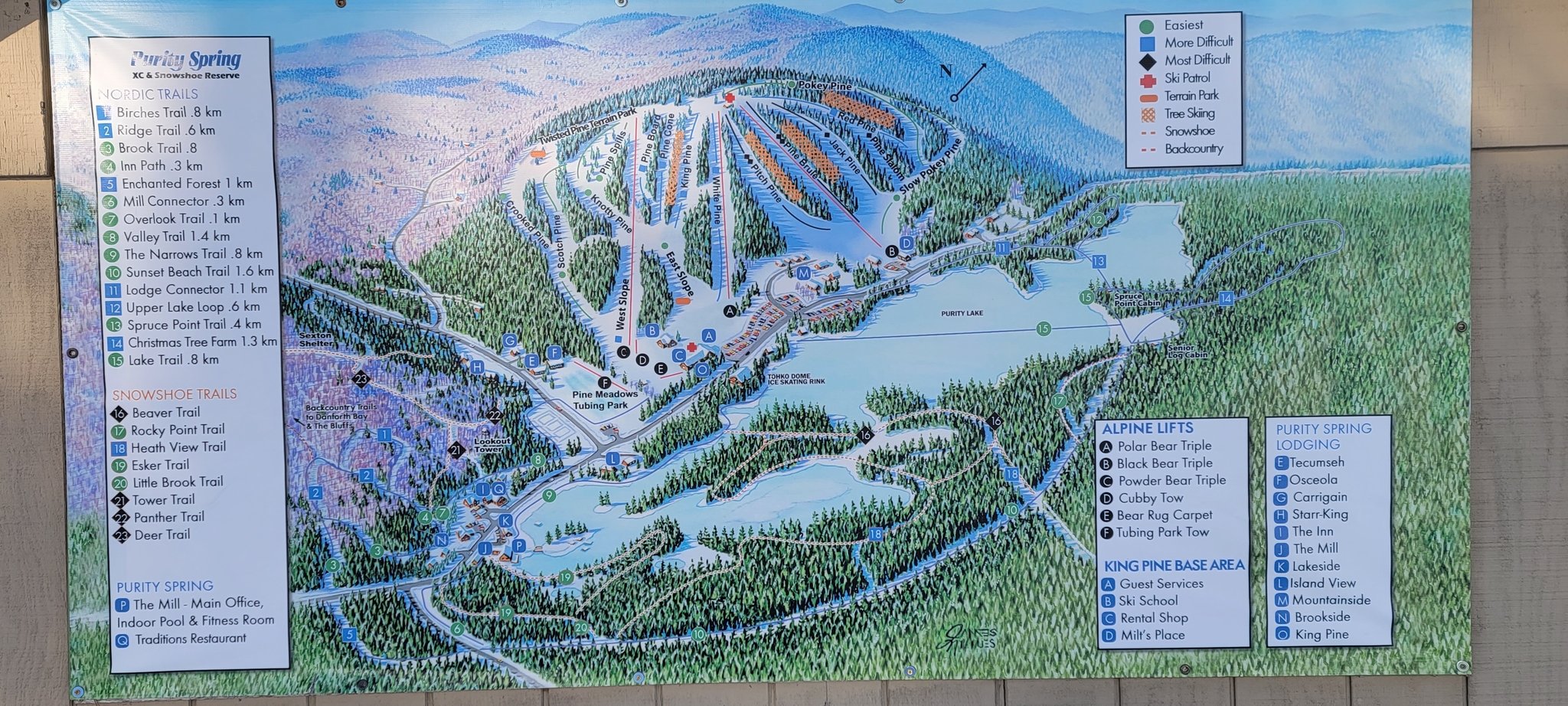 The trails at King Pine were perfect for my youngest daughter, who is just learning how to ski. She was able to navigate the easy trails with ease and had a great time exploring the slopes. The food in the cafeteria was also a highlight for us – we were pleasantly surprised by the quality and variety of options available.